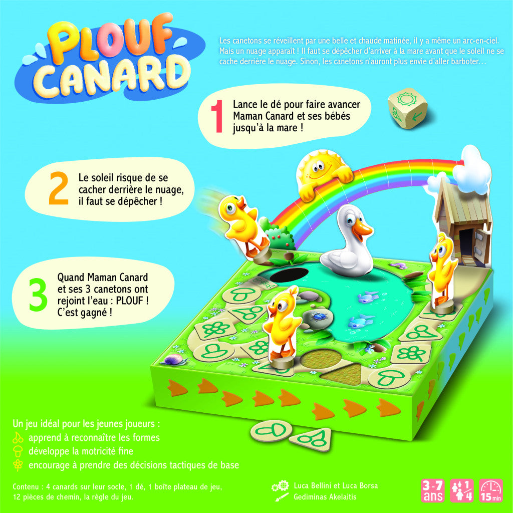 Plouf Canard est un jeu coopératif qui se joue en famille. Accessible dès 3 ans, le jeu vous propose d'emmener les canards jusqu'à la mare avant que le soleil ne disparaisse !