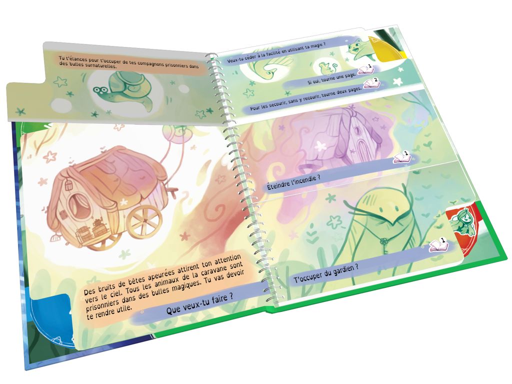 Maintenant, ton aventure peut commencer. Tu vas pouvoir lire ce livre normalement, de gauche à droite, mais rapidement, tu feras face à des choix matérialisés par des pages coupées en trois. Tourne la partie de ton choix et découvre ce qui va se passer. Après plusieurs choix, tu arriveras à la fin de ton aventure… Réussiras-tu à récupérer le Livre du Savoir de ton peuple ?