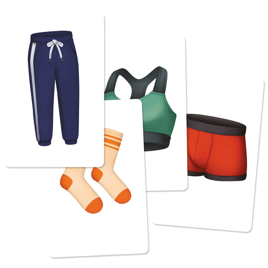 Chaque joueur possède 6 piles de cartes, faces cachées, devant lui. Au top départ, 4 cartes sont retournées face visible au centre de la table. Tout le monde joue en même temps. Prenez l’une de vos piles en main et regardez son contenu, vous pouvez échanger une carte de votre pile, face visible, contre n’importe quelle autre carte du centre de la table. Bien entendu tout le monde agissant de même, les cartes du centre vont changer en permanence et un joyeux chaos va régner. Dès que vous possédez une pile des 4 mêmes vêtements (mais de couleurs différentes), laissez-la face visible devant vous. Quand un joueur a réussi à constituer 6 piles, il crie Pile ! On vérifie, et s’il ne s’est pas trompé, il remporte la partie.